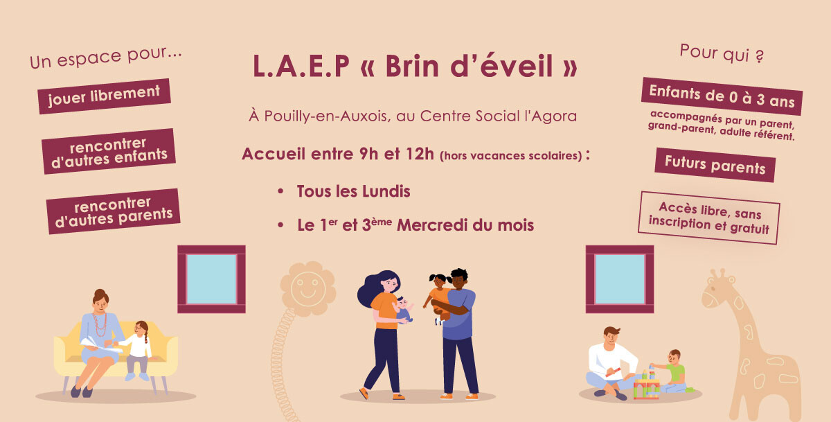 Je me permets de vous contacter pour vous parler du Lieu d'Accueil Enfant Parent (L.A.E.P) "Brin d'éveil", situé dans les locaux du Centre Social. Le LAEP est ouvert depuis le 1er Janvier 2025 aux parents (grands-parents, adultes référents hors professionnels) accompagnés de leur enfant de moins de 3 ans.