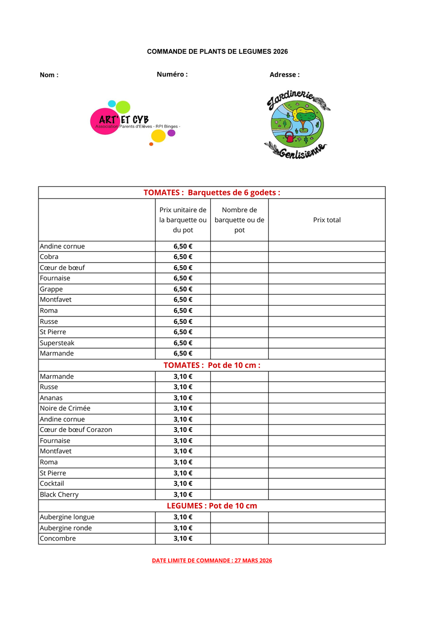 Pour ce printemps, en collaboration avec la Jardinerie Genlisienne, Art'Et Cyb organise une vente de plants potagers et floraux au profit de l'école du RPI.
