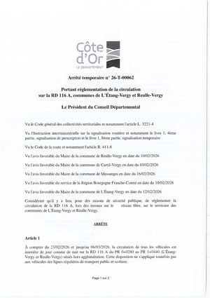 La circulation de la rue de Reulle jusqu’à Reulle-Vergy sera interdite du 23/02 au 06/03/26 suite à des travaux pour la fibre.