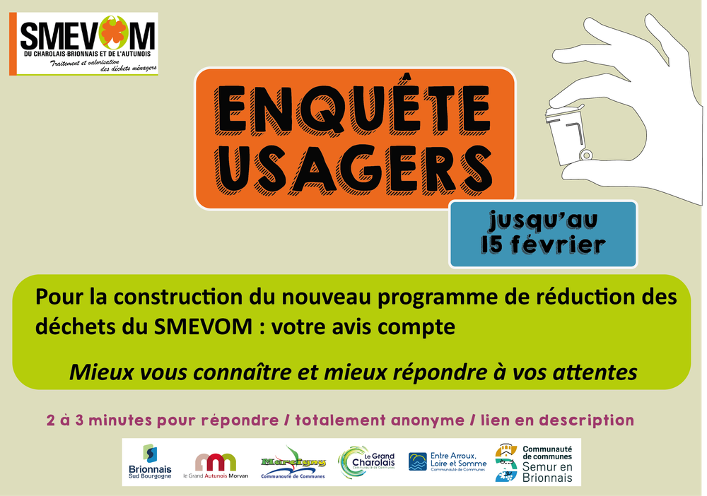 Le SMEVOM du Charolais Brionnais Autunois fait appel à votre contribution qui nous permettra de mieux comprendre les enjeux spécifiques du territoire et d’adapter les actions à venir pour une gestion des déchets plus responsable et durable.