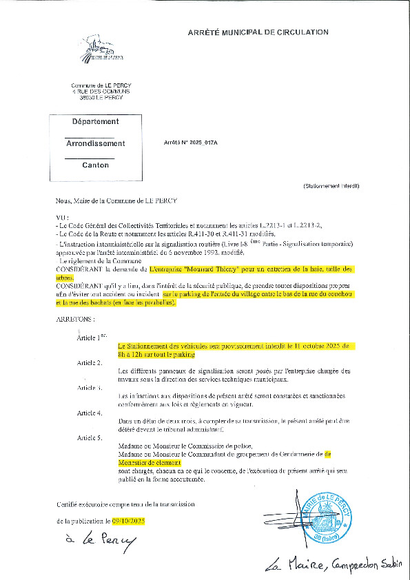 Le stationnement sur tout le parking en face des poubelles à l'entrée du village est INTERDIT le samedi 11 octobre le matin de 8h à 12h