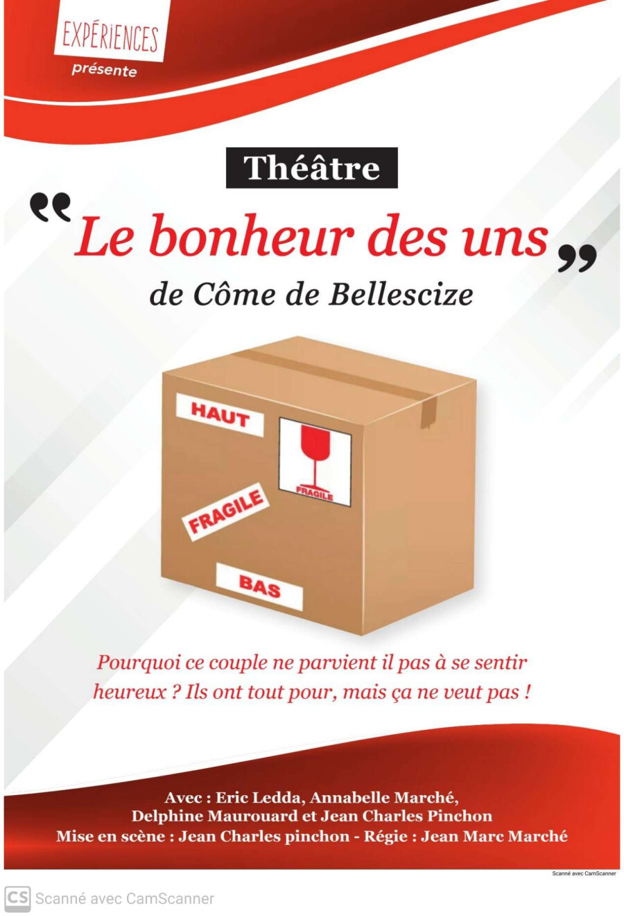 Jean Charles Pinchon, Compagnie Expériences Vernon, vous propose de venir assister à la pièce de théâtre "le bonheur des uns" dont la représentation se tiendra le Samedi 15 novembre à 20h30 dans la salle des fêtes d'Houlbec-Cocherel :
