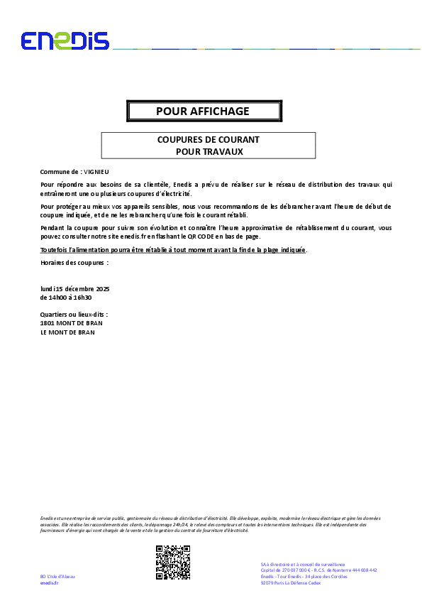 "Afin d'améliorer la qualité de la distribution électrique et de répondre aux besoins de notre clientèle, nous réalisons des travaux sur le réseau électrique qui vous alimente qui entraineront une ou plusieurs coupures d'électricité".