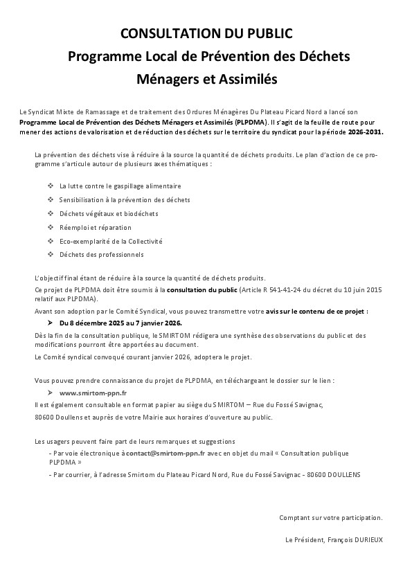 Le Syndicat Mixte de Ramassage et de traitement des Ordures Ménagères Du Plateau Picard Nord a lancé son Programme Local de Prévention des Déchets Ménagers et Assimilés (PLPDMA). Il s’agit de la feuille de route pour mener des actions de valorisation et de réduction des déchets sur le territoire du syndicat pour la période 2026-2031.