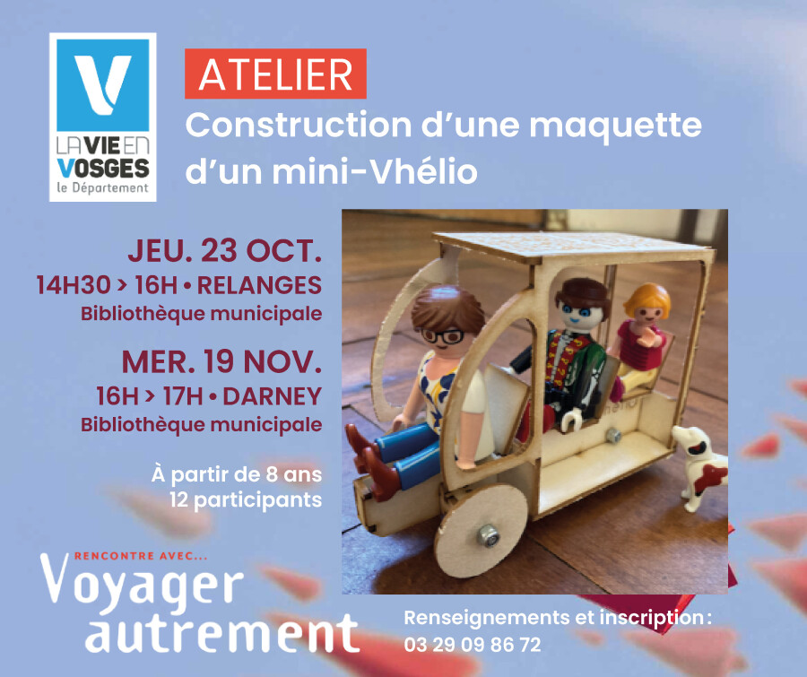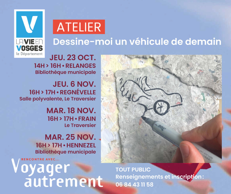 En octobre et novembre, la Communauté de Communes participe au programme d'animations Rencontre avec... Voyager autrement ! proposé par la Médiathèque Départementale des Vosges. Pour vous inscrire, appelez le service mobilité