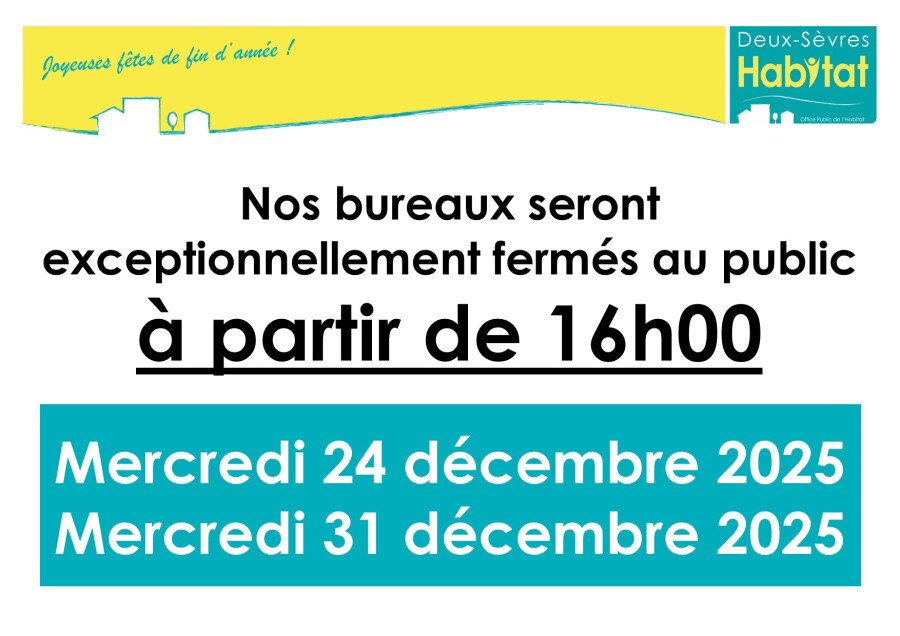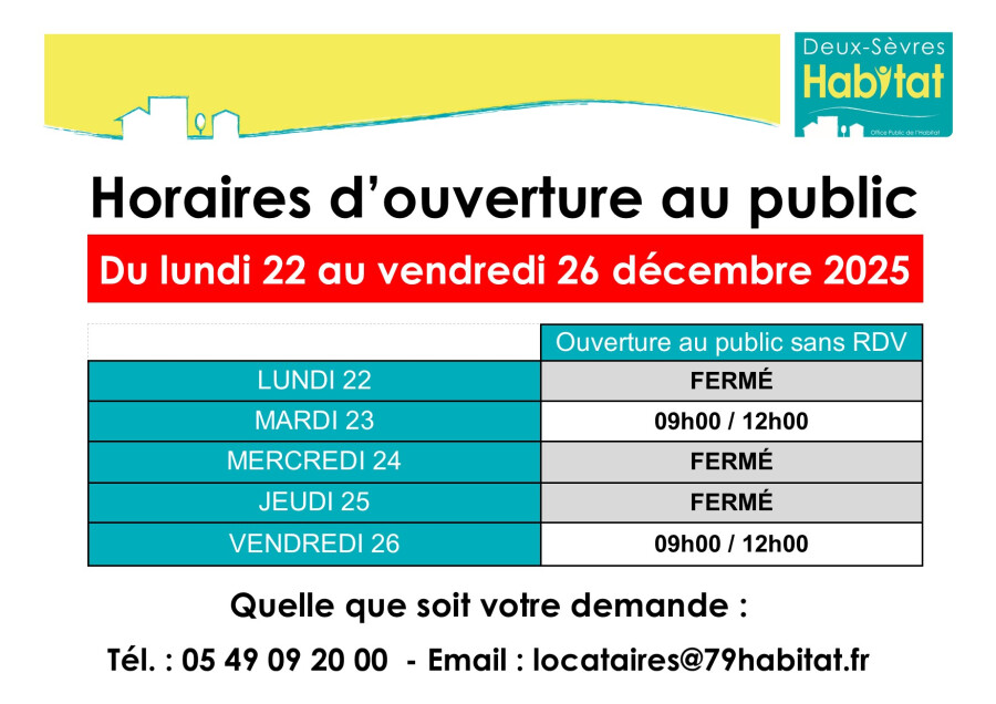 Modification des horaires d'ouverture de l'agence de Saint-Maixent-L'Ecole durant la semaine du 22 au 26 décembre 2025.