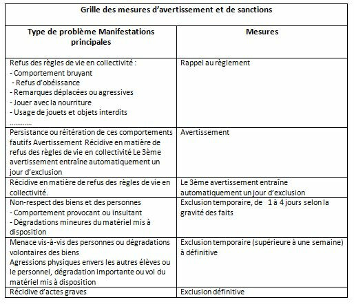 Article 5-6 : Tout manquement est constitutif d’une faute pour laquelle peut correspondre une sanction allant de l’avertissement à l’exclusion définitive de la cantine et de la garderie selon la gravité des faits ou des agissements. Une grille des mesures d’avertissement et de sanctions indique les sanctions encourues pour chaque cas d’indiscipline constaté.