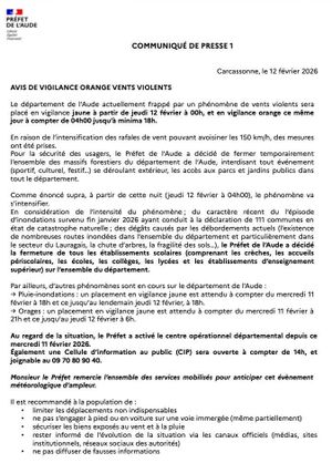 #TempêteNils 🔴 Météo-France place le département de l’Aude en vigilance rouge « vents violents » jeudi 12 février de 6h à 14h. La vigilance passera ensuite en orange le jeudi 12 février jusqu’à 18h.