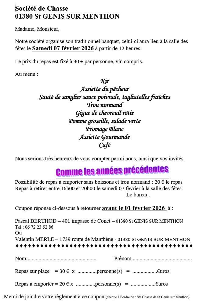 La société organise son traditionnel banquet, celui-ci aura lieu à la salle polyvalente