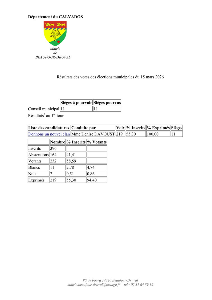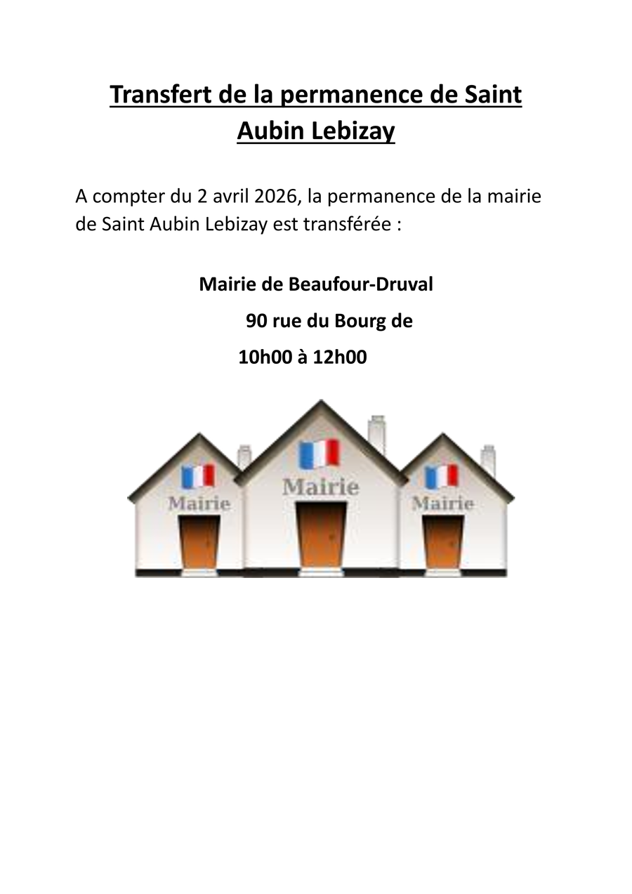 La permanence de la Mairie de Saint Aubin Lebizay sera transférée à compter du 2 avril 2026 à la Mairie de Beaufour-Druval