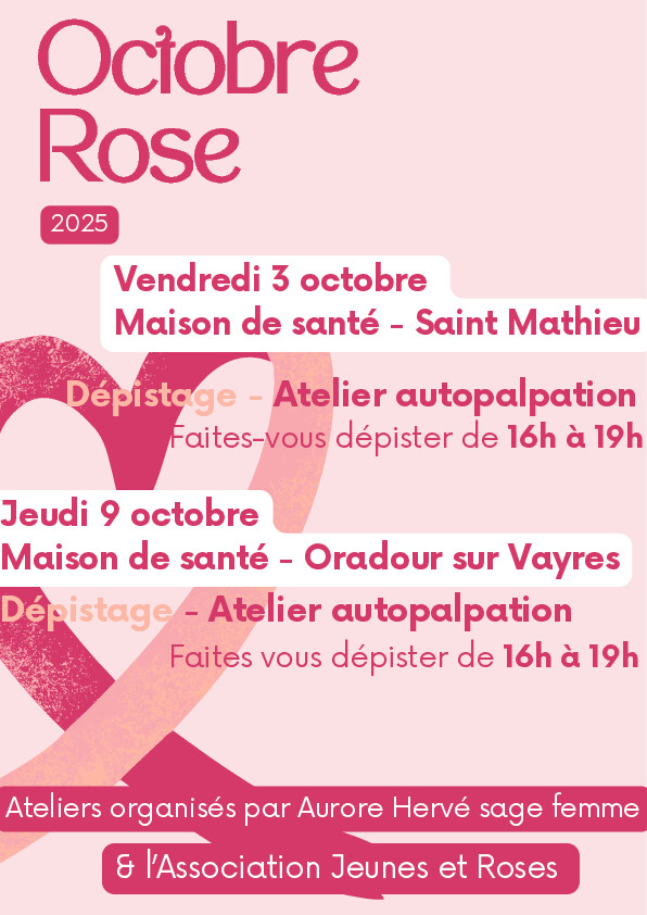 Dans le cadre d’Octobre Rose, la Maison de Santé organise deux ateliers d’initiation à l’autopalpation animés par Aurore Hervé, sage-femme, en partenariat avec l’association Octobre Rose.