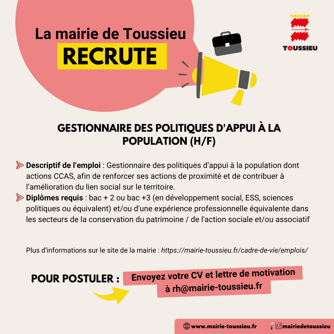 Pour plus d’informations sur la fiche de poste rendez-vous sur : https://mairie-toussieu.fr/cadre-de-vie/emplois/