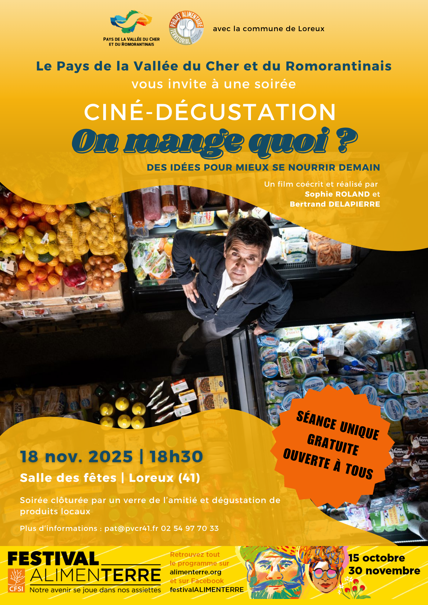 Dans le cadre de son Projet Alimentaire de Territoire, le Pays de la Vallée du Cher et du Romorantinais vous propose l’animation une soirée ciné-dégustation gratuites et ouvertes à tous à l’occasion du Festival AlimenTERRE pour une agriculture et une alimentation plus durable. Ces temps seront l’occasion de se retrouver autour de la question des modes d’alimentation et suivre Thomas Sotto, journaliste TV et animateur radio, dans son voyage à travers la France à la poursuite de bonnes idées pour mieux se nourrir demain.