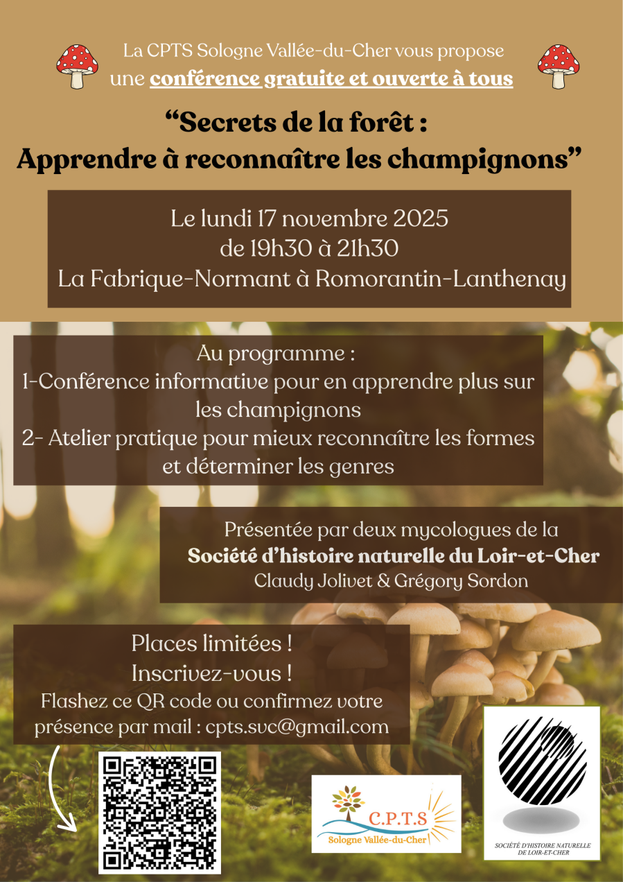 "Apprendre à reconnaître les champignons" , cette conférence gratuite et ouverte à tous, animée par deux mycologues de la Société d'histoire naturelle du Loir-et-Cher, se tiendra le lundi 17 novembre de 19h30 à 21h30 à la Fabrique Normant de Romorantin-Lanthenay.