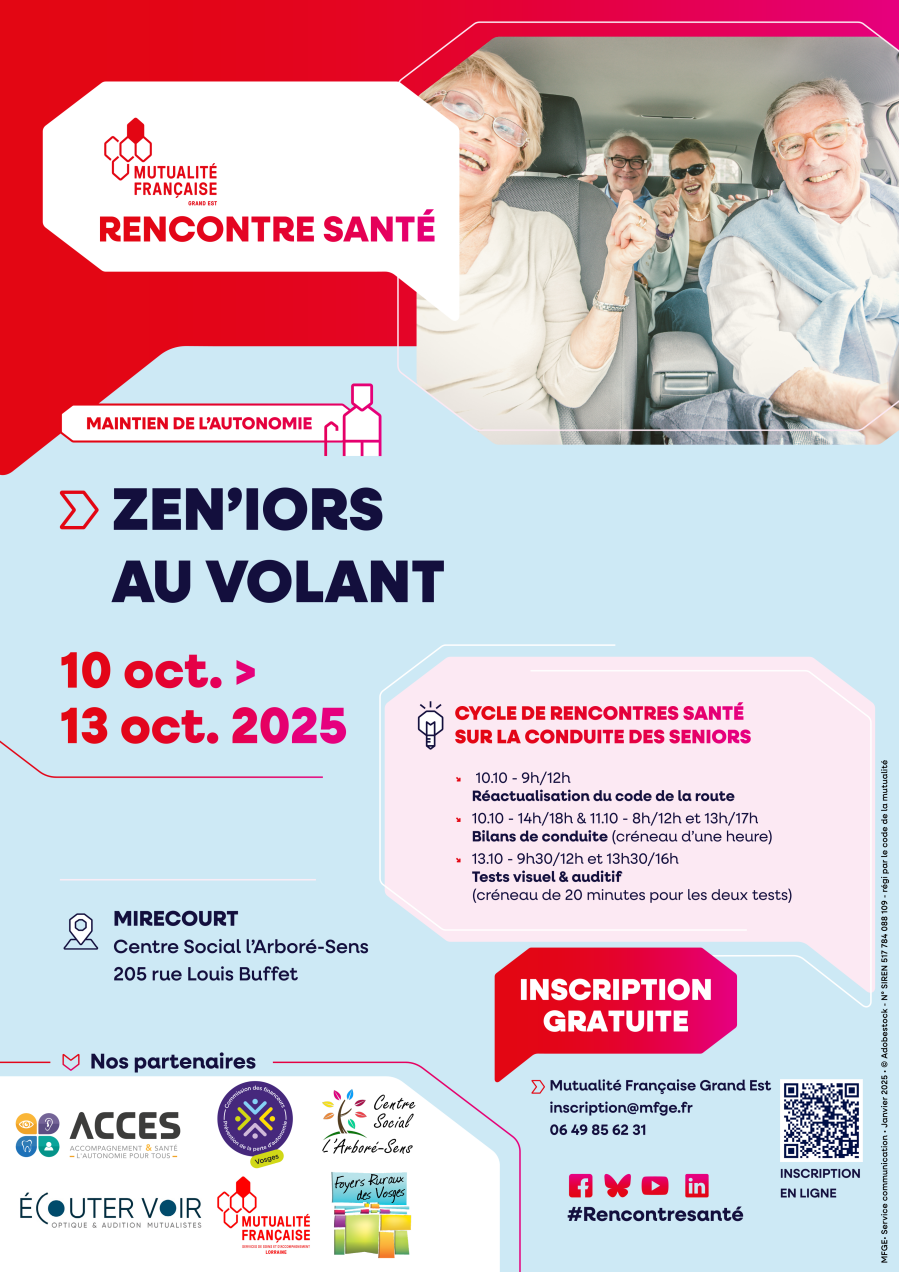 Cette action gratuite et ouverte à tou.te.s. sur inscriptions est mise en place grâce au soutien financier de la commission des financeurs 88. Renseignements et inscriptions : 06 49 85 62 31 inscription@mfge.fr ou https://grandest.mutualite.fr/evenements/zeniors-au-volant-a-mirecourt/