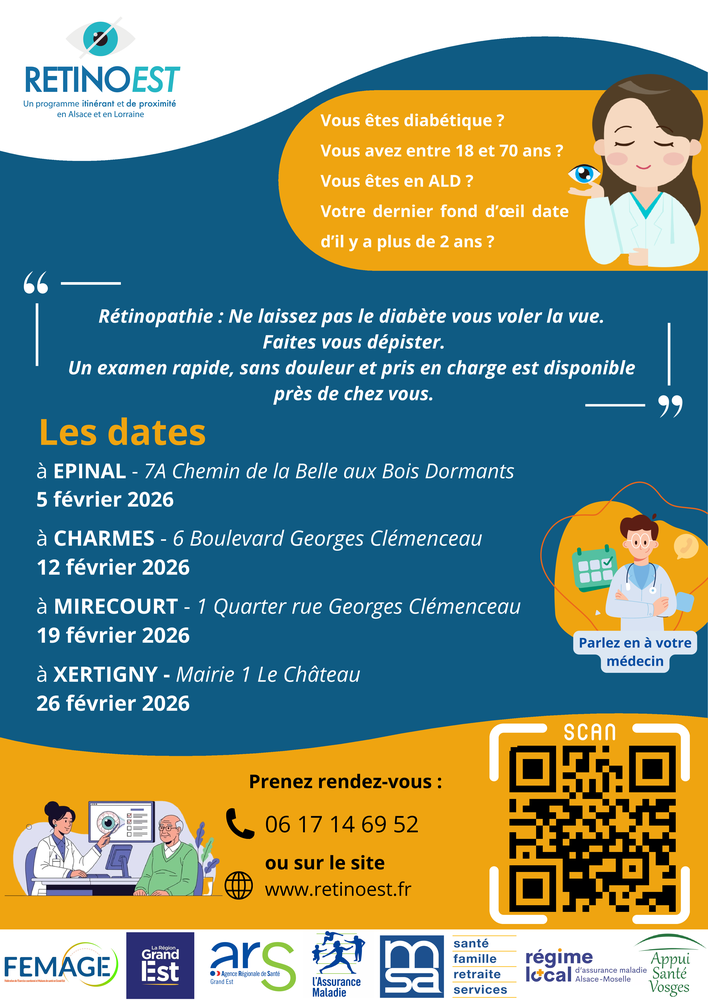 Cette journée vise à informer et à toucher un maximum d’habitants du territoire, notamment les diabétiques. Une orthoptiste réalisera sur place un dépistage de la rétinopathie diabétique : examen rapide, indolore et sans dilatation.