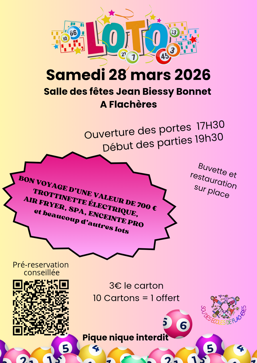 QR code sur l'affiche ou lien suivant : https://www.helloasso.com/associations/sou-des-ecoles-de-flacheres/evenements/loto-2026