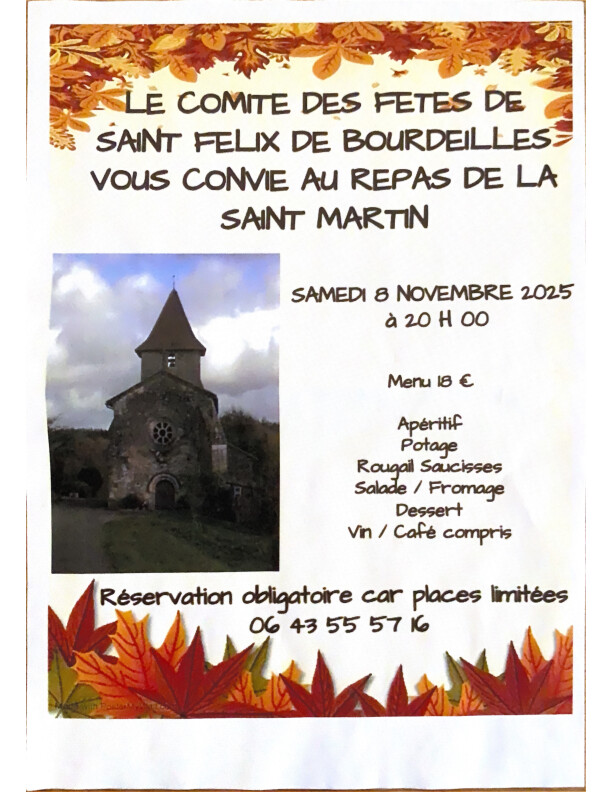 Le comité des fêtes organise le repas de la Saint Martin, le samedi 08 Novembre à 20H00, à la salle des fêtes de Saint Félix de Bourdeilles.