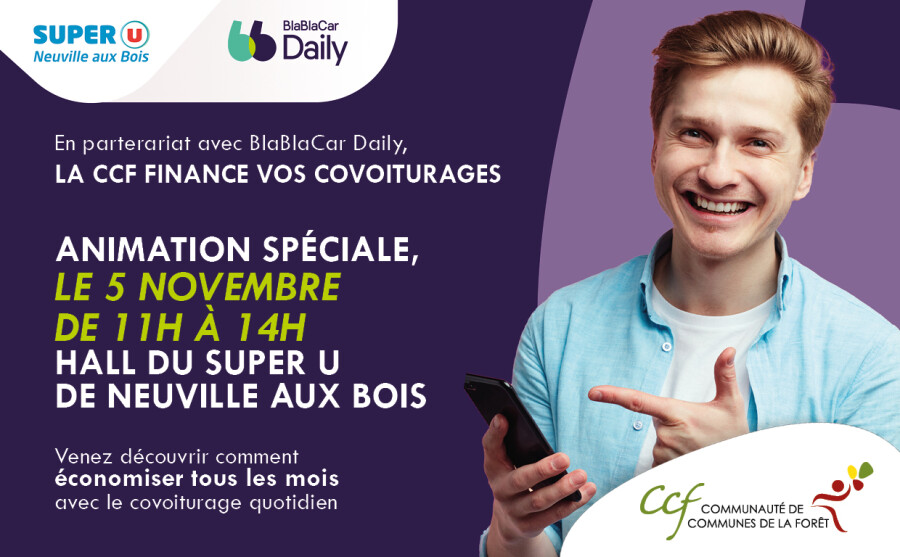 La Communauté de communes de la Forêt finance les covoiturages du quotidien. Venez vous renseigner sur ce dispositif auprès de l’opérateur BlaBlaCar Daily, le mercredi 5 novembre 2025 de 11h à 14h dans le hall du Super U de Neuville-aux-Bois.