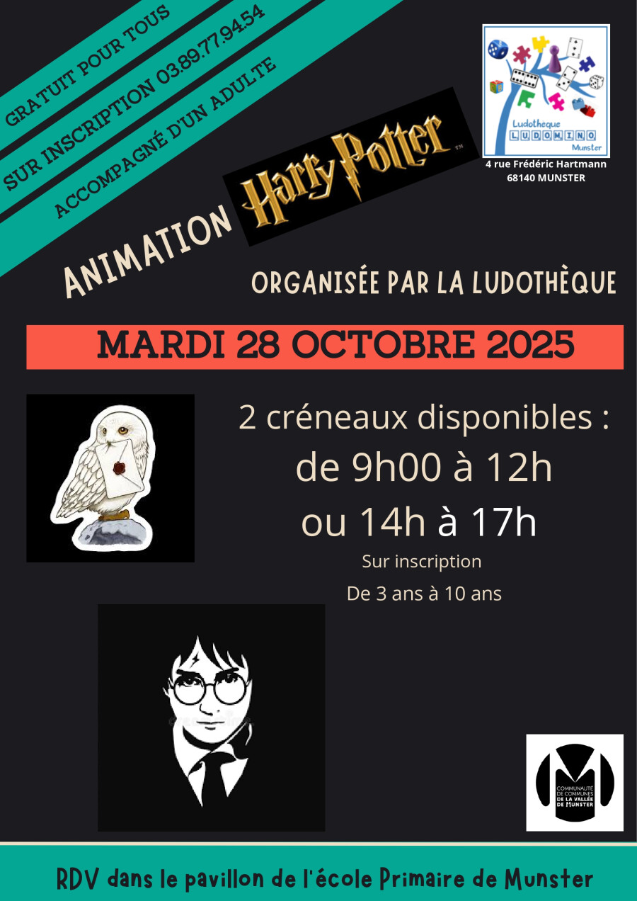 La ludothèque organise une animation autour de l’univers de Harry Potter le mardi 28 octobre 2025, au pavillon de l’école primaire de Munster.