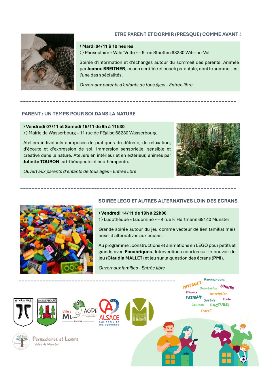 Après une édition 2023 des plus réussies, les membres du Réseau Local Parents de la Vallée de Munster finalisent actuellement un programme varié (sophrologie, conférence, théâtre d'impro, soirée legos, ciné-débat, sorties nature) en lien avec le thème défini et dans différentes communes de la CCVM. Programme à paraître courant octobre !