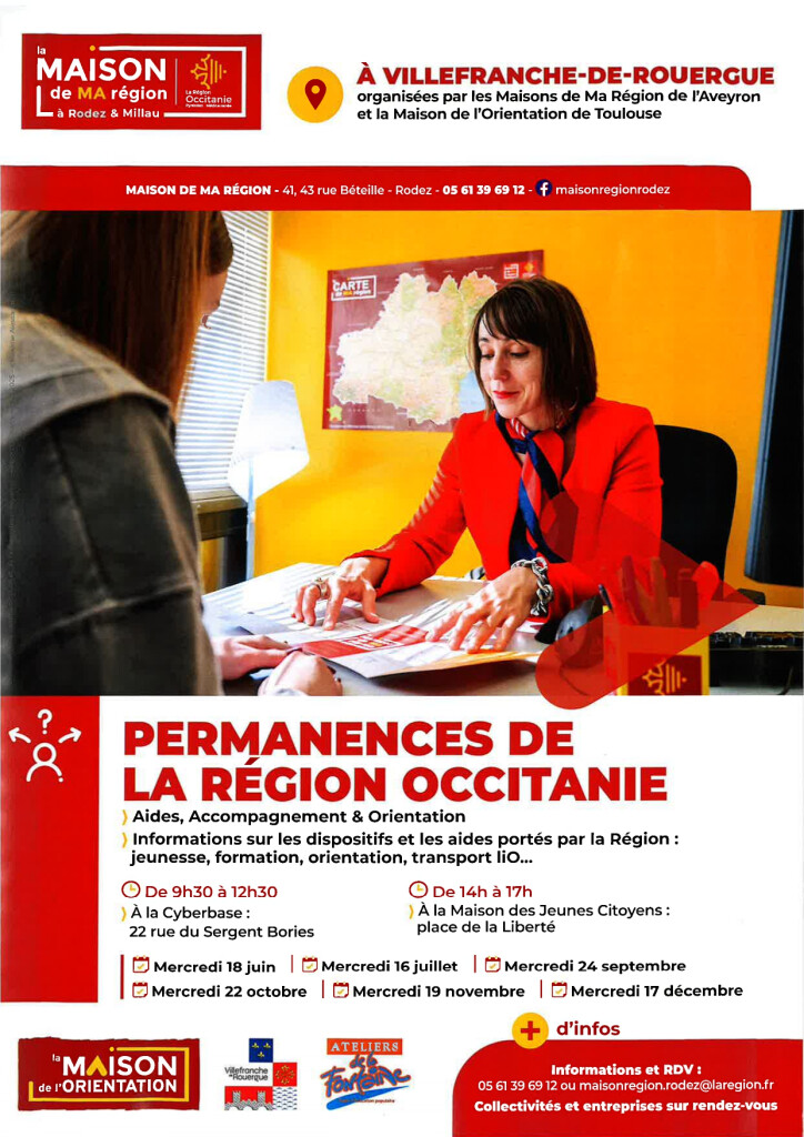 Nous vous informons que la prochaine permanence de la Région Occitanie à Villefranche-de-Rouergue, aura lieu le mercredi 17 décembre. Cette permanence sera l’occasion de répondre à vos interrogations et de vous accompagner dans vos démarches. Les services territorialisés des Maisons de Ma Région de l’Aveyron ainsi que de la Maison de l’Orientation de Toulouse seront à l’écoute des particuliers, associations, collectivités et entreprises pour les accompagner dans leurs démarches dans le cadre des dispositifs régionaux notamment : Jeunesse : Carte Jeune / LoRdi / Stages en Entreprise Orientation professionnelle : scolaire, demandeur d’emploi, salarié, en reconversion… Formation et les aides à l’embauche (mobilité, garde d’enfants, […]