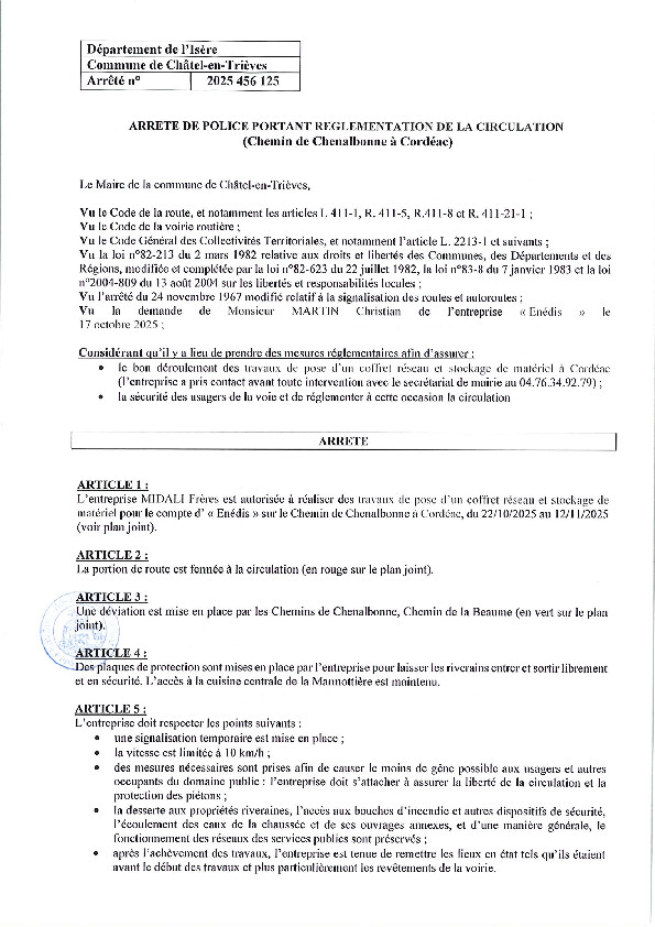 La route qui va de la Marmottière vers le haut du village (Chenalbonne) est temporairement coupée jusqu'au 12 novembre pour des travaux d'Enedis.