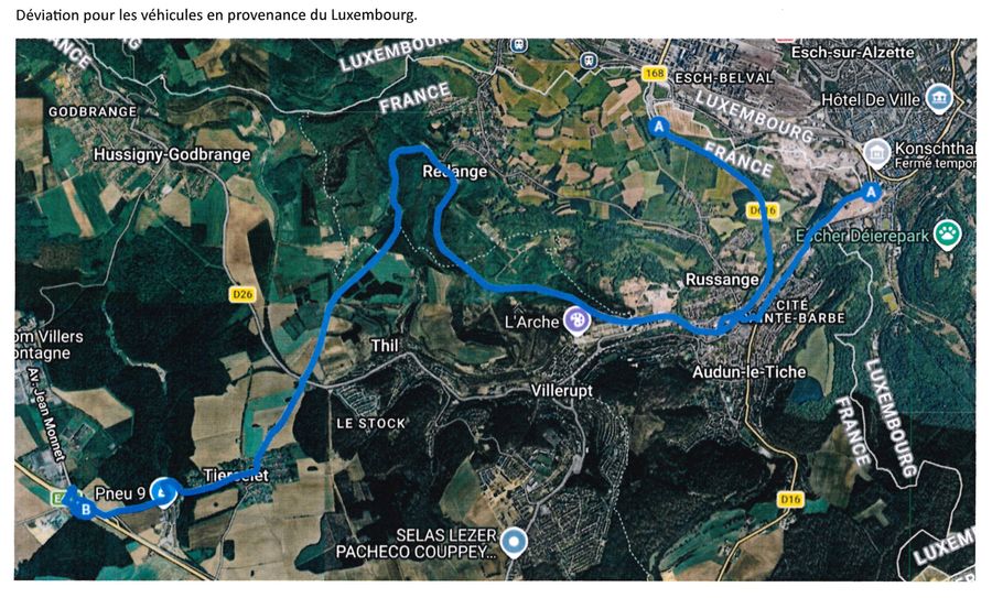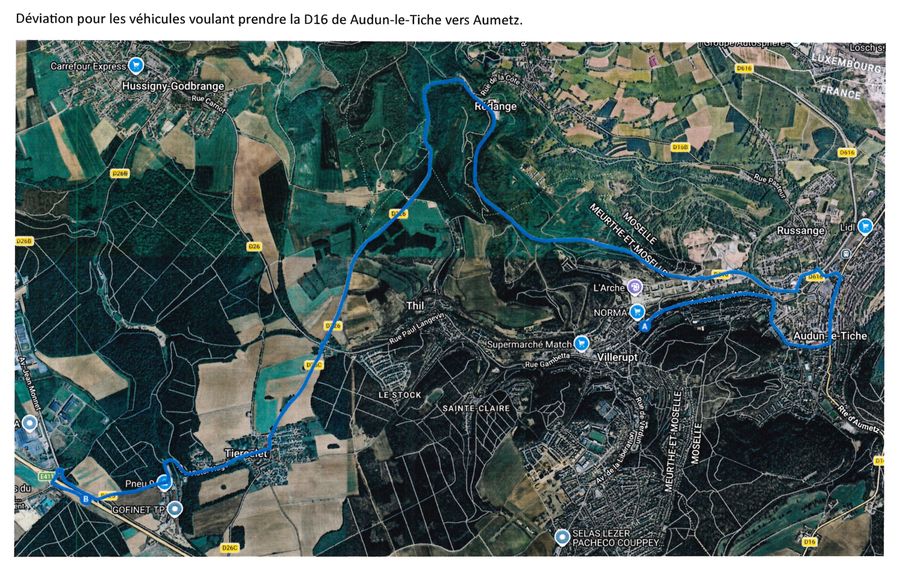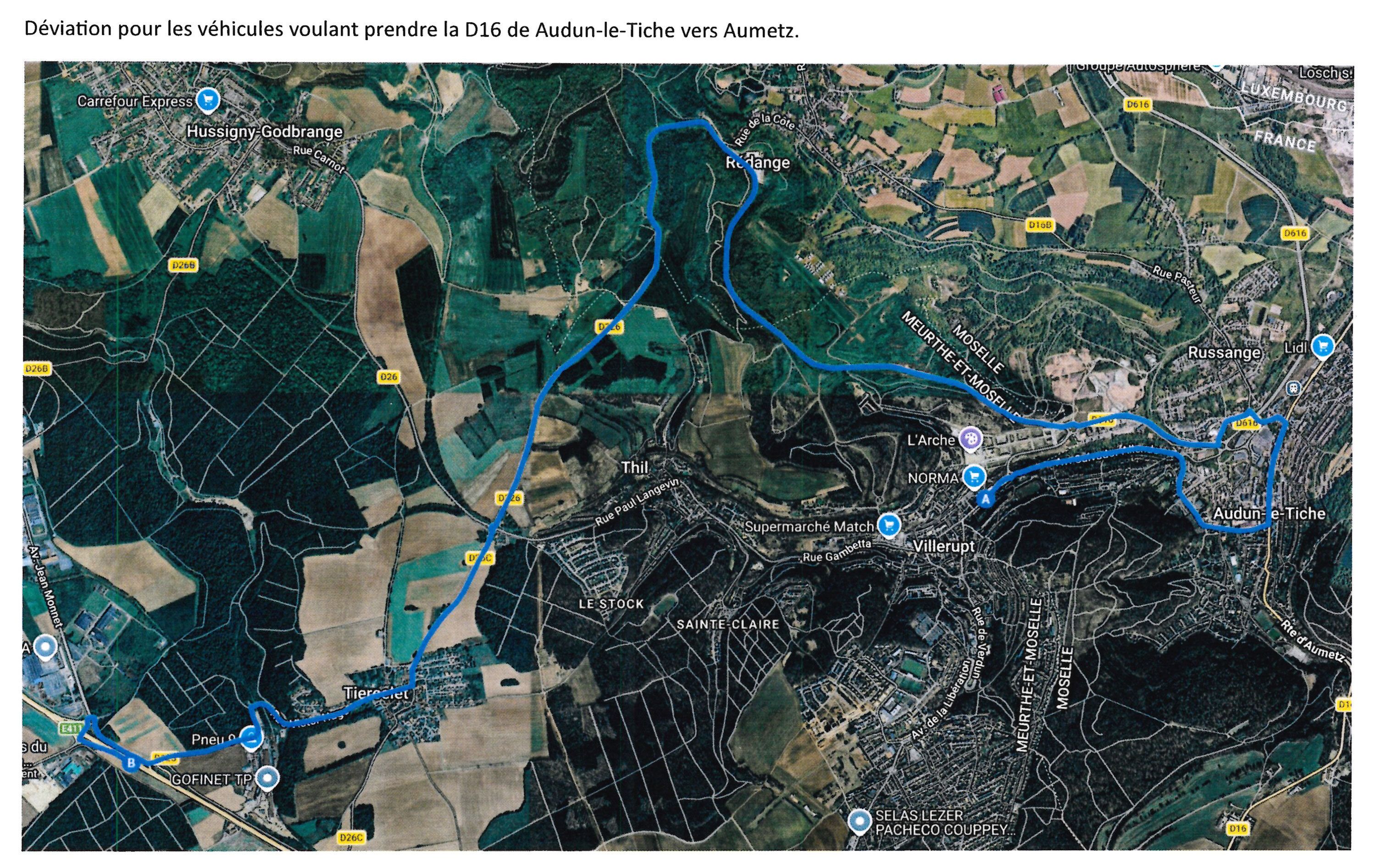 Une fermeture complète de la route départementale D 16 est prévue le mercredi 22 avril 2026 de 08h30 à 17h00 afin de terminer les travaux d'enrobés. De ce fait, la circulation de l'ensemble des véhicules transitant par Audun-le-Tiche sera fortement perturbée.