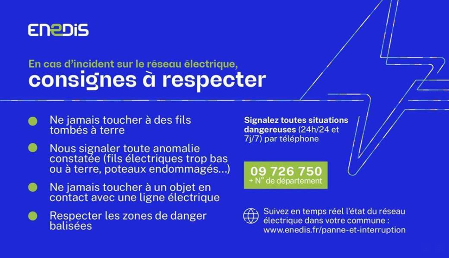 En cas de danger visible, fil à terre, nous vous recommandons d'appeler en priorité le Centre d’Appel Dépannage au numéro réservé uniquement aux élus et services communaux 0811 01 02 12 + code postal de votre commune.