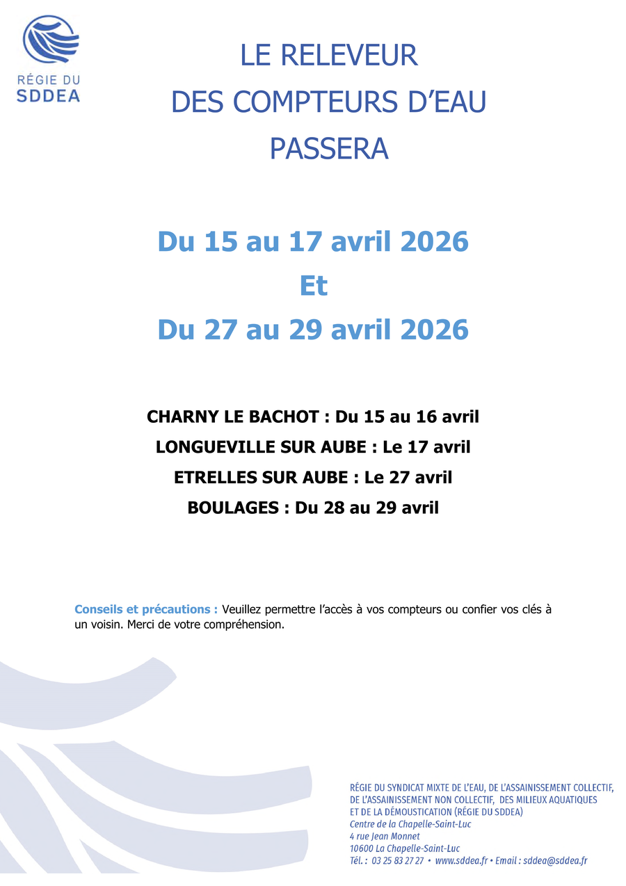 Je vous informe que suite à une campagne de recherche de fuites sur la commune de LONGUEVILLE SUR AUBE, des coupures d’eau ponctuelles (15min) seront réalisées le 9/04 sur l’ensemble des communes suivantes :