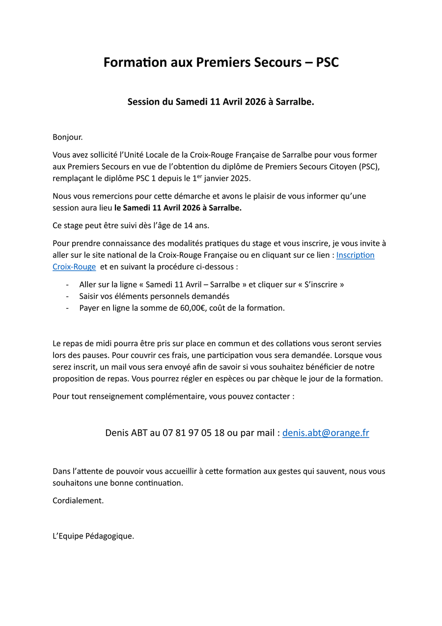 L'Unité Locale de Sarralbe de la Croix-Rouge organise une formation aux premiers secours le samedi 11 Avril 2026 permettant l'obtention du diplôme de Premiers Secours Citoyen (PSC).
