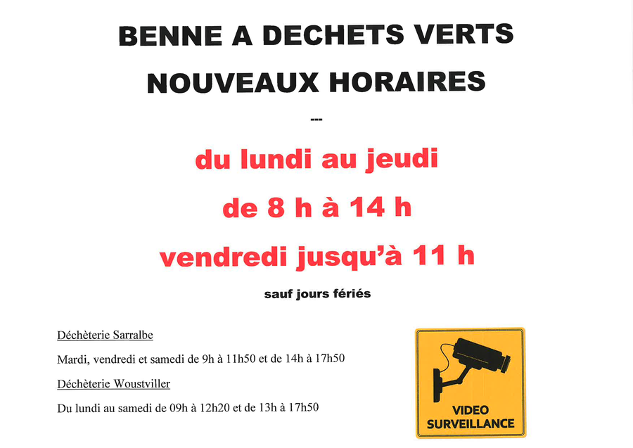 Le service de collecte des déchets rappelle à la population que les déchèteries de ROUHLING, SARREGUEMINES, ZETTING, SARRALBE et WOUSTVILLER passent en heures d'hiver à compter du 1er novembre et ce, jusqu’au 31 mars 2026.