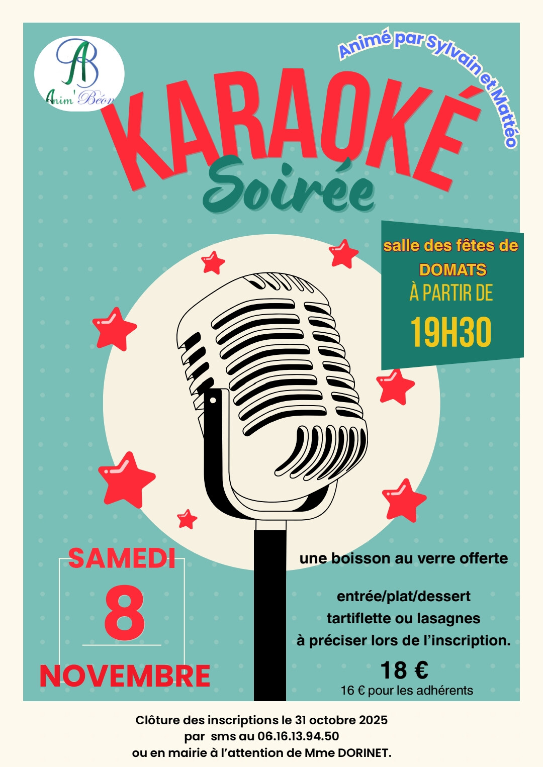 L association anim beon organise une soirée karaoké le 8 novembre à la salle des fêtes de domats