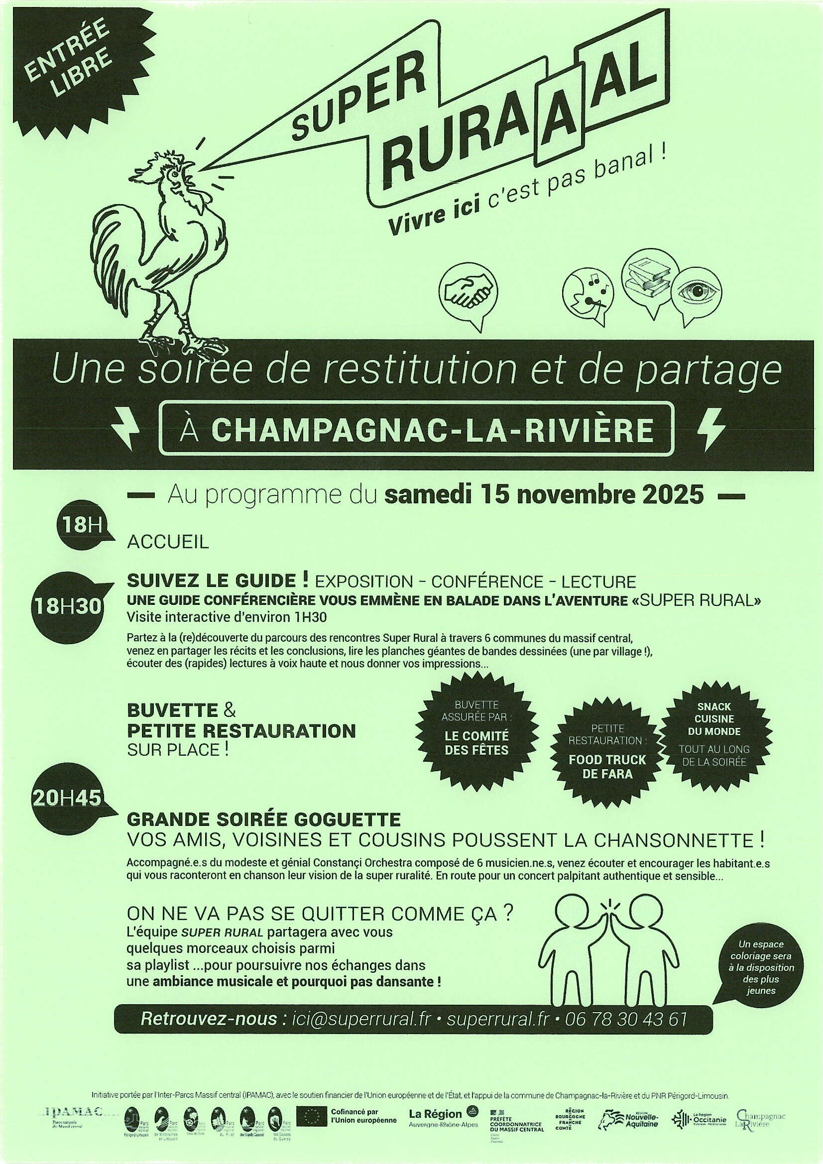 L'évènement SUPER RURAL, C'est pas banal est en cours de préparation! échanges, grande soirée goguette, restauration sur place au programme du 15 novembre. Venez partager ce super moment avec vos ami.e.s, voisin.e.s à la Salle des Fêtes de Champagnac!