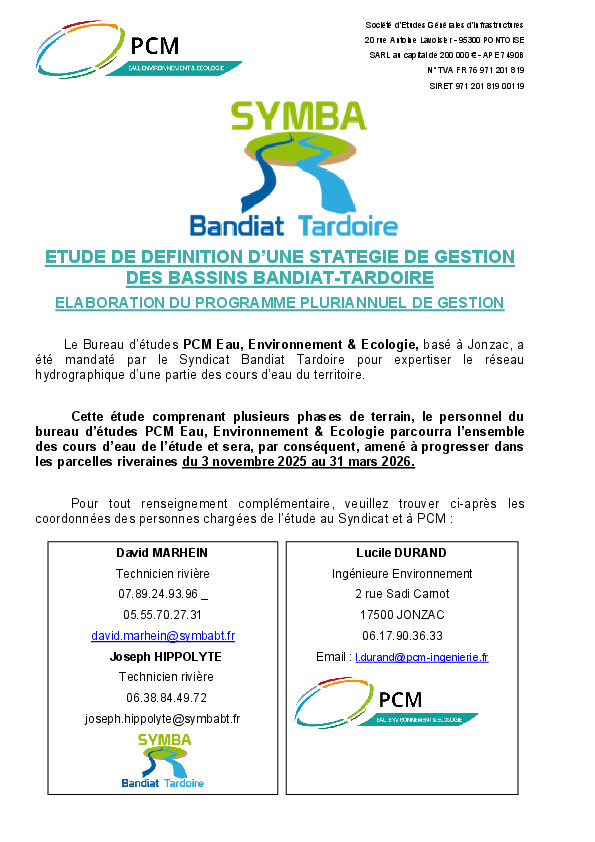 Dans le cadre d'une étude hydrographique, des techniciens du bureau d'études PCM Eau, Environnement et Ecologie seront amenés à traverser des parcelles privées entre le 03/11/2025 et le 31/03/2026.