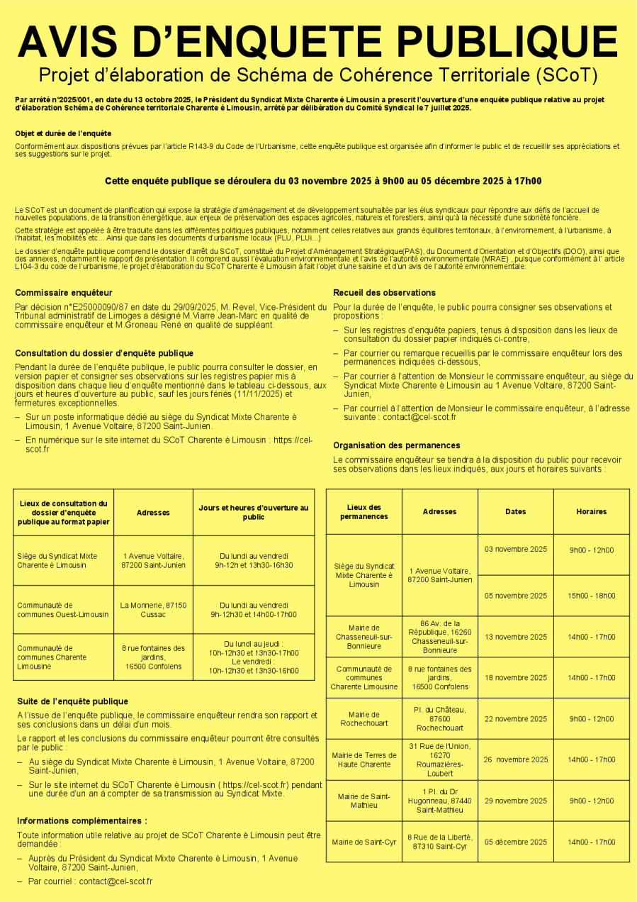 Le Schéma de Cohérence Territoriale SCOT. Ce document est élaboré au niveau de plusieurs communautés de communes. Il planifie les projets d'aménagement, d'habitat, d'urbanisme, d'environnement pour les communes de Charente et Limousin