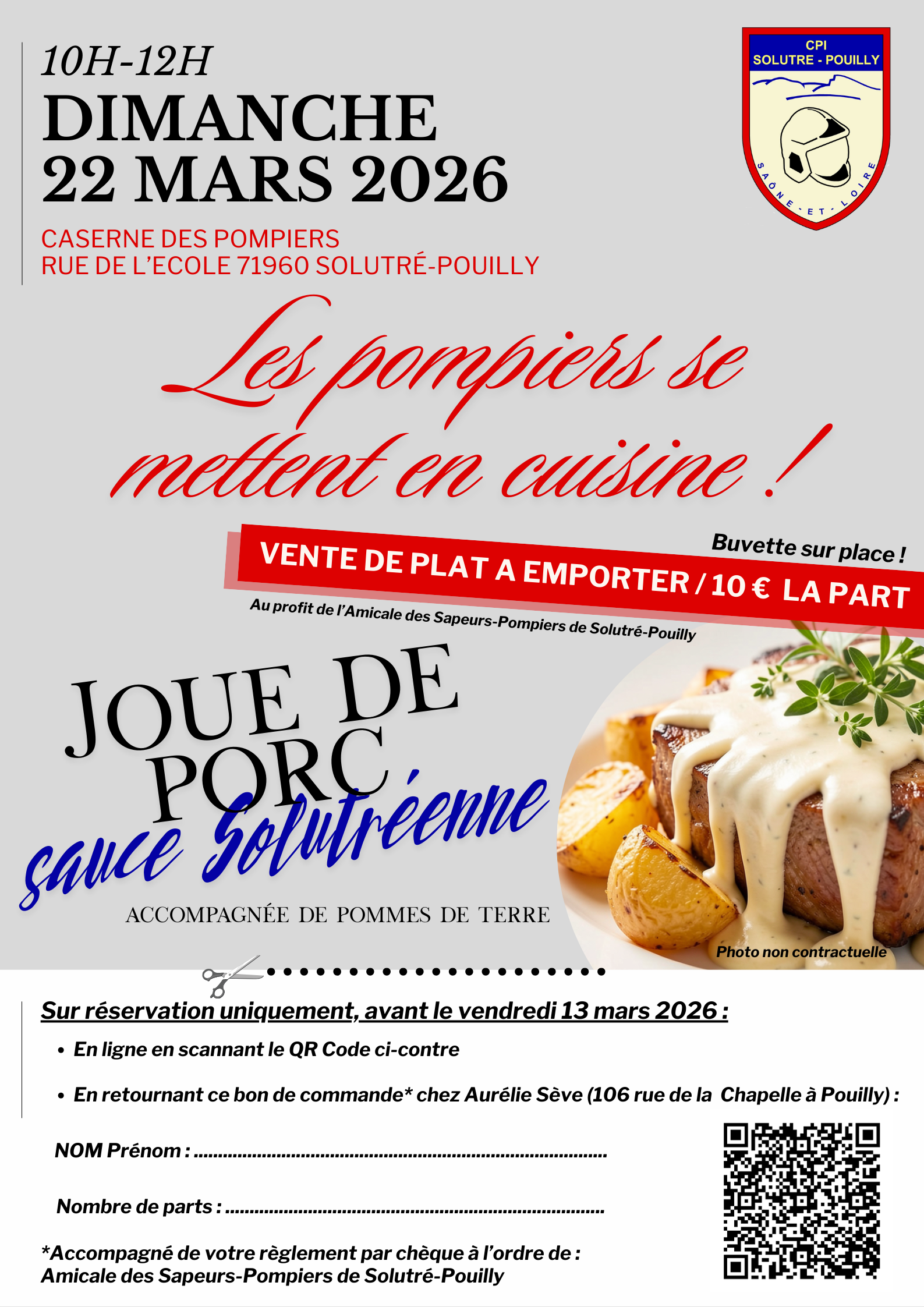Les sapeurs-pompiers de Solutré-Pouilly ont le plaisir de vous proposer une vente de plats à emporter, préparés avec soin.