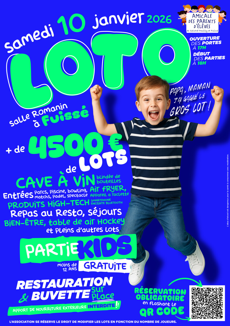 L'amicale des parents d'élÚves des écoles du RPI Solutré Pouilly Fuissé organise son traditionnel LOTO le samedi 10 janvier 2026 à partir de 18h (ouverture des portes à 17h) à la salle Romanin à Fuissé.