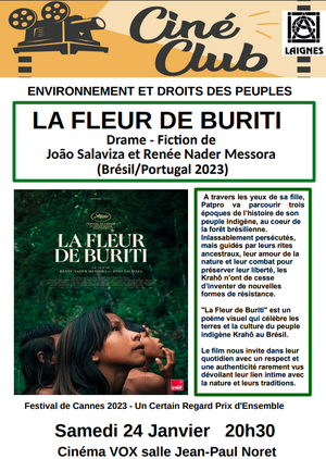 - LA FLEUR DE BURITI présenté au Ciné-club : une plongée au coeur d'un luxuriant et fragile paradis amazonien où le peuple indigène Krahô lutte pour sa survie. Engagé, poétique, raccord avec la sublime délicatesse des Krahô, La Fleur de Buriti est un film rare et puissant, d'une beauté visuelle saisissante.