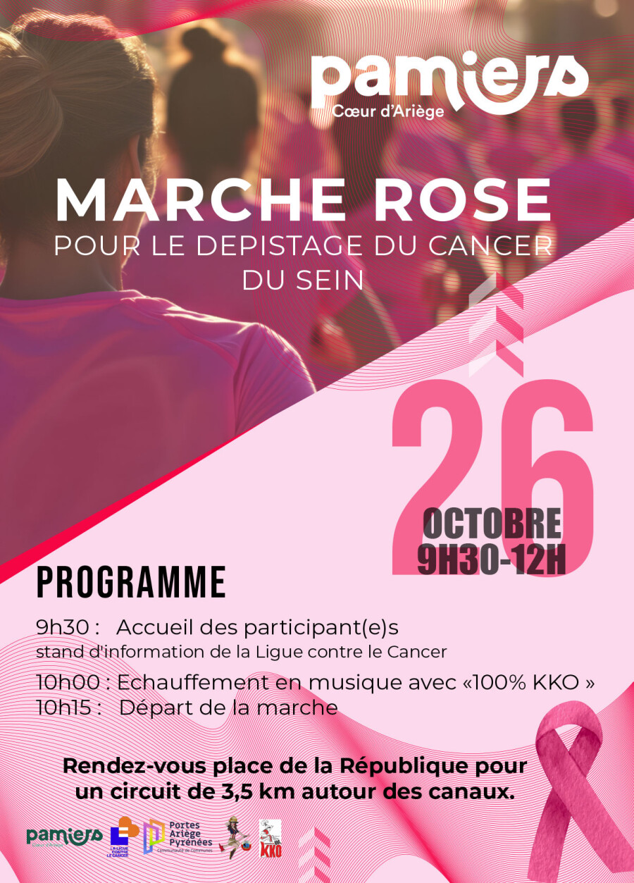 Nous vous donnons rendez-vous place de la République, dimanche 26 octobre, pour une Marche Rose de 3,5km autour des canaux de Pamiers.