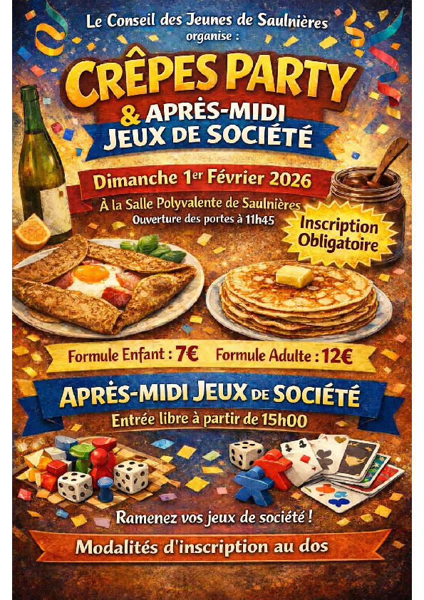 🍴 Midi : Menu complet (Galette salée + Crêpe sucrée + Boisson). 🎲 Après-midi : Jeux de société en libre accès et vente de crêpes pour les gourmands !