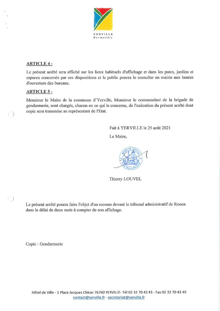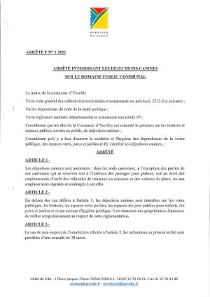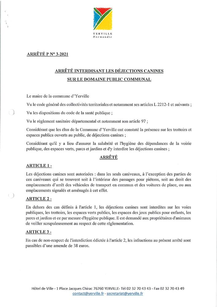 Selon l'article 2, les déjections canines sont interdites sur les voies publiques, les trottoirs, les espaces verts publics, les espaces des jeux publics pour enfants, les parcs et jardins et ce par mesure d'hygiène publique.