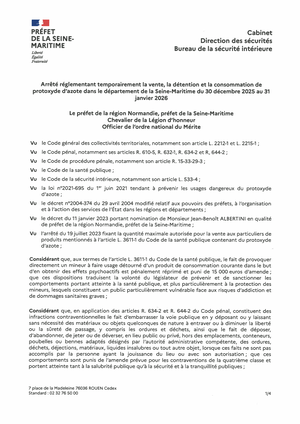 Par Arrêté préfectoral du 1er février au 28 février 2026 inclus, la vente, la cession à titre onéreux ou gratuit et toute forme de mise à disposition de protoxyde d'azote sont interdites aux particuliers dans le département de la Seine-Maritime.