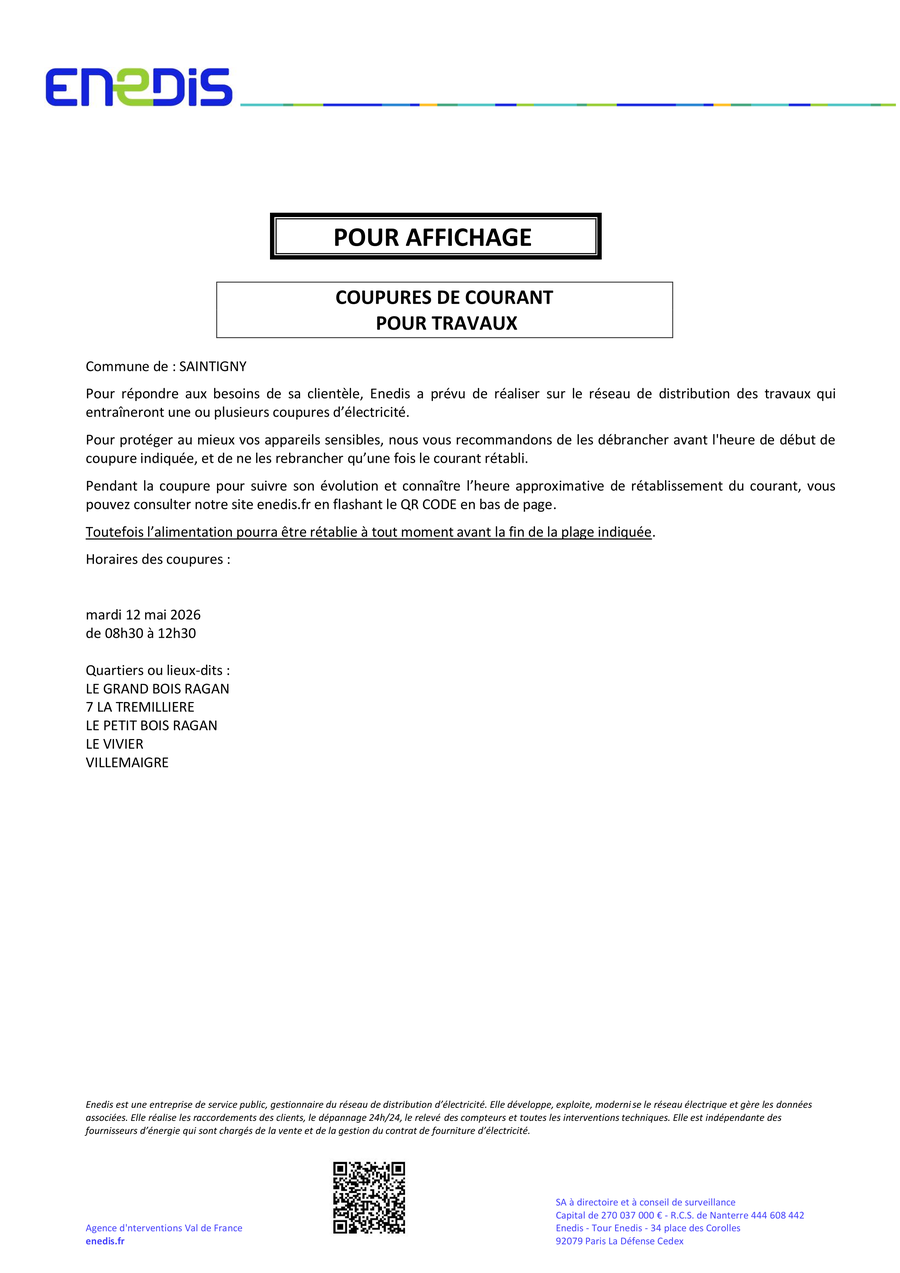 Enedis vous informe d'une coupure de courant pour travaux concernant la commune de SAINTIGNY.
