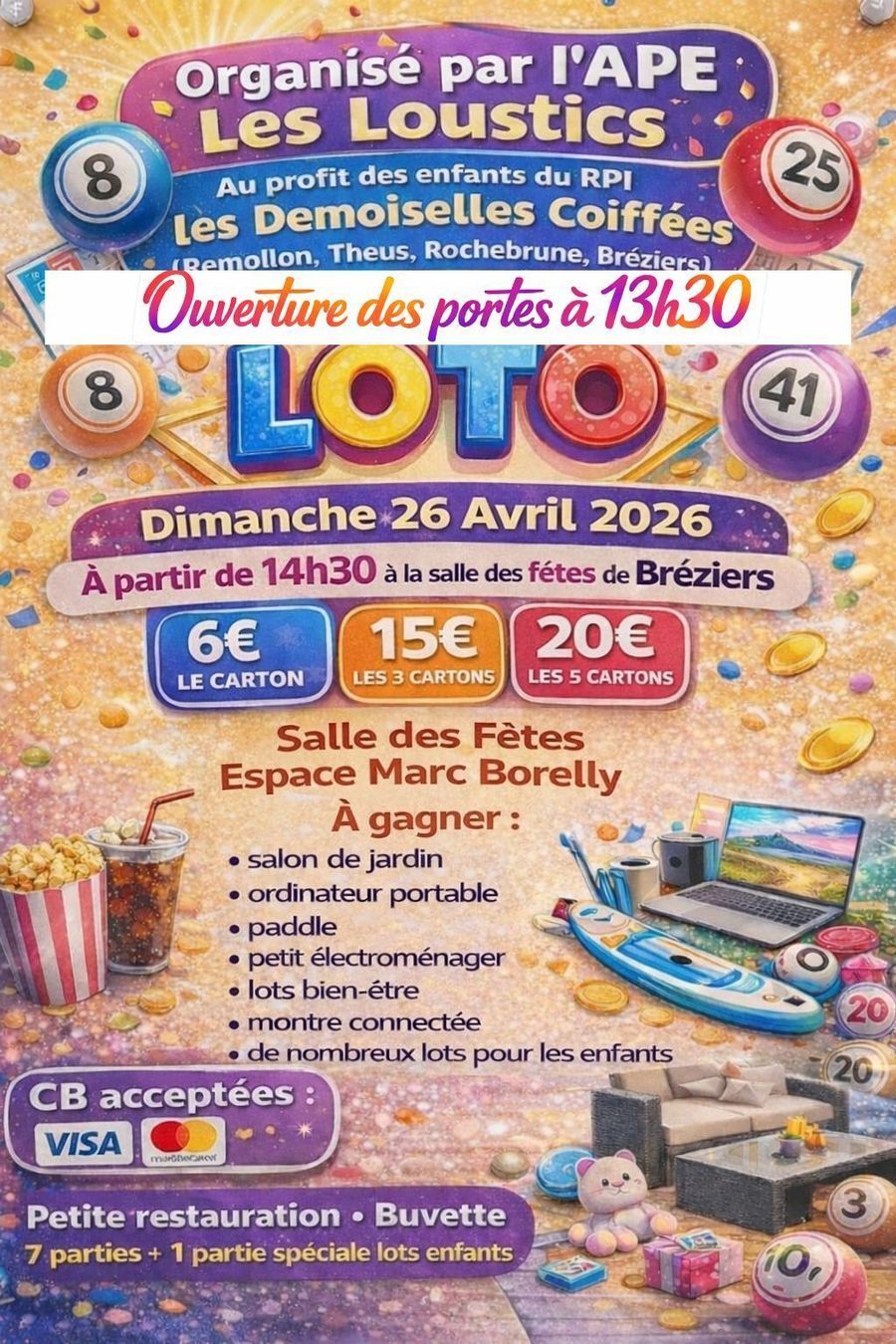 Grand loto organisé au profit des écoles du RPI les Demoiselles Coiffées qui regroupe Théus, Rochebrune, Bréziers et Remollon. Nombreux lots.