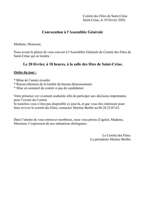 Rendez vous à tous les habitants qui veulent s'investir dans le comité des fêtes de notre village le 20 Février à 18:00.