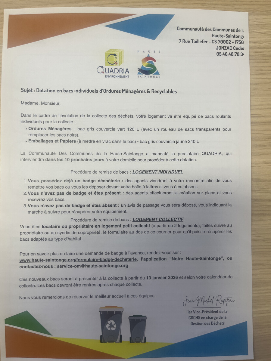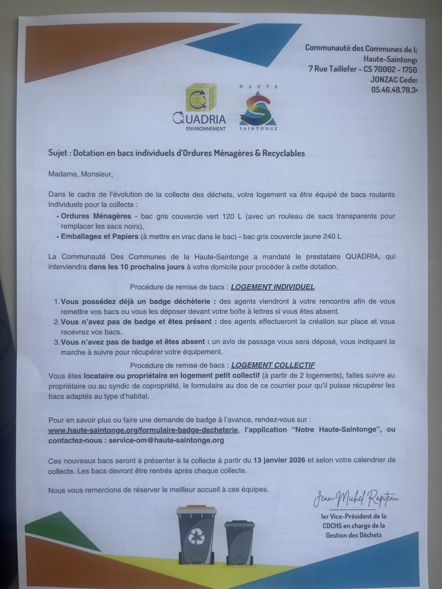 Veuillez trouver ci-joint le flyer de communication de la communauté de communes d’Haute Saintonge pour la dotation des bacs individuels d’ordures ménagères et recyclables