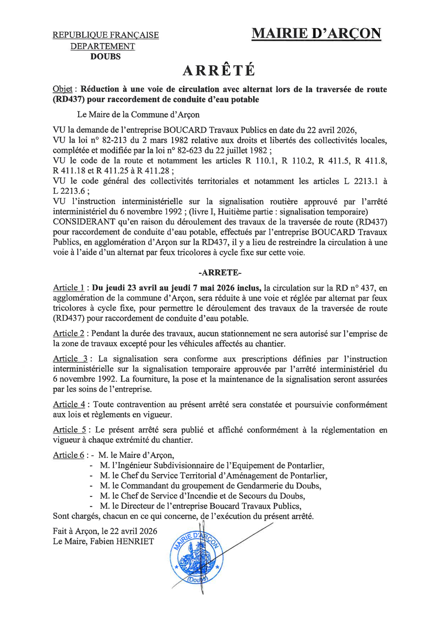 Le secrétariat de la mairie d'Arçon sera fermé exceptionnellement le jeudi 30 avril 2026.