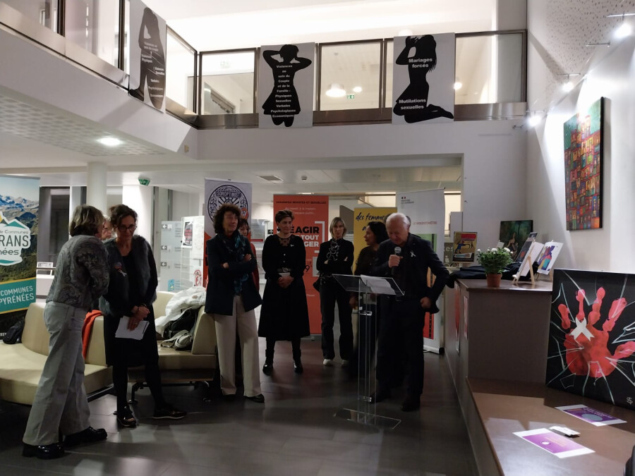 Cérémonie pour la journée internationale pour l'élimination de la violence à l'égard des femmes au Centre Hospitalier Ariege Couserans en présence de la sous préfète Emilie Barromes, de Christine Tequi prèsidente du conseil départemental de l'Ariège et de Michel Pichan maire de Saint Lizier et président du conseil de surveillance.