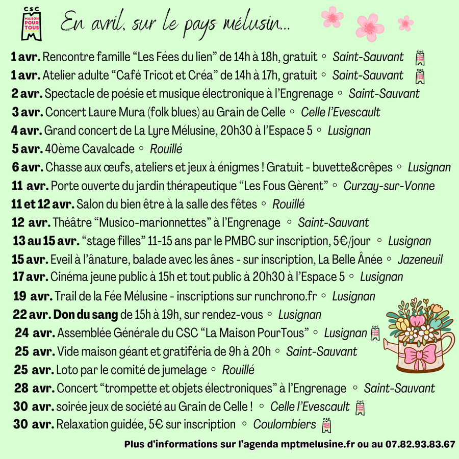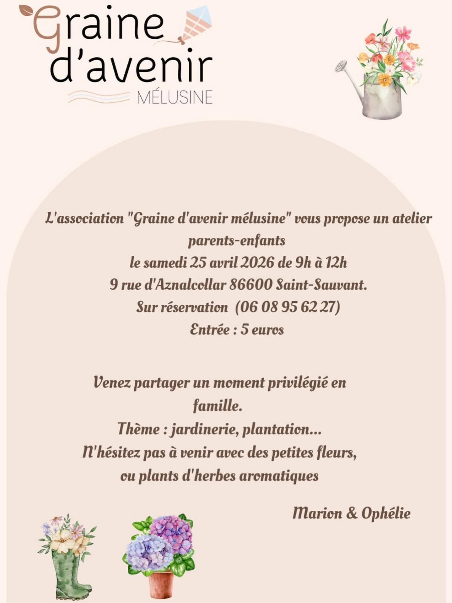 L’association « Graine d’avenir mélusine » vous propose un nouvel atelier parents-enfants le samedi 25 avril à partir de 9h00. 🌷🌿